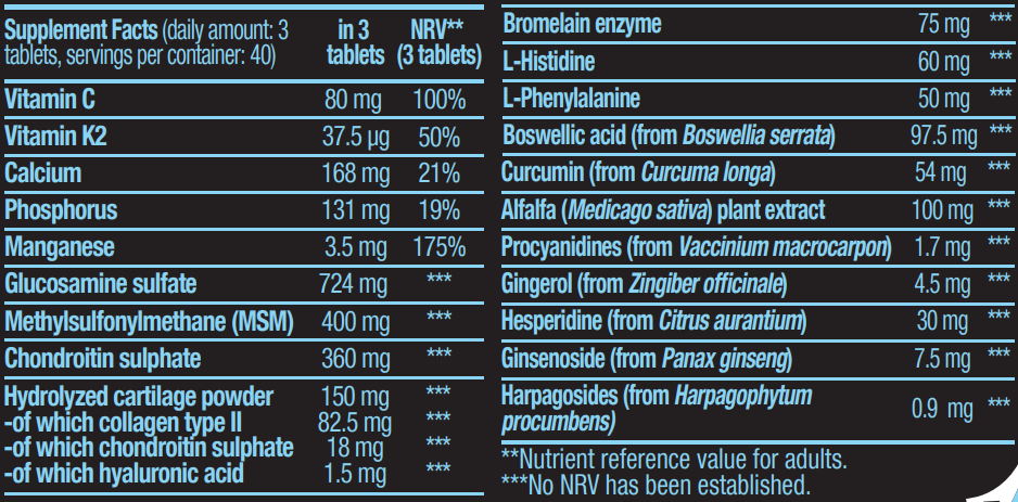 Bulking agent (cellulose gel), glucosamine sulphate KCl (crustaceans) 18%, calciumsalts of orthophosphoric acid, methylsulfonylmethane 7.6% [methylsulfonylmethane, anti-caking agent (silicon dioxide)], chondroitin sulphate 7.6%, coating [stabilisers (polyvinyl alcohol-polyethylene glycol-graft-co-polymer, polyvinyl alcohol), anti-caking agents(talc, mono- and diglycerides of fatty acids), colour (iron oxides and hydroxides)], cranberry (Vaccinium macrocarpon) fruit extract, Indian frankincense (Boswellia serrata) gumresin exract, ChondrActiv® hydrolyzed cartilage powder 2.8%, anti-caking agents (magnesium salts of fatty acids, silicon dioxide), bromelain powder, alfalfa (Medicago sativa) plant extract, ginger extract [ginger (Zingiber officinale) rhizome extract, maltodextrin], L-ascorbic acid, turmeric (Curcuma longa) rhizome extract, L-Histidine, L-Phenylalanine, hesperidin (from Citrus aurantium fruit extract), grapple plant (Harpagophytum procumbens) root extract, manganese sulphate, Korean ginseng (Panax ginseng) root extract, K2VITAL® menaquinone.