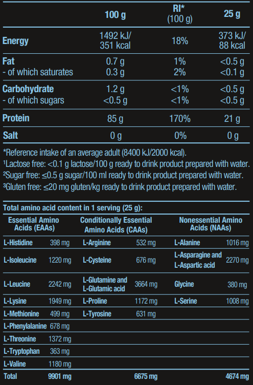Η προηγμένη σύνθεση του βασίζεται σε πρωτεΐνη υψηλής ποιότητας με συγκέντρωση που αγγίζει το 90%, απαλλαγμένη από ζάχαρη, λακτόζη και γλουτένη. Χάρη στις ειδικές τεχνικές φιλτραρίσματος, η Iso Whey Zero Clear είναι εξαιρετικά χαμηλή σε λιπαρά και υδατάνθρακες, καθιστώντας το ιδανική επιλογή για περιόδους γράμμωσης ή για άτομα με ευαισθησία στη λακτόζη. Επιπλέον, η προσθήκη σκόνης Chlorella εμπλουτίζει το προφίλ της με θρεπτικά συστατικά, υποστηρίζοντας τη συνολική ευεξία και τη μυϊκή λειτουργία.