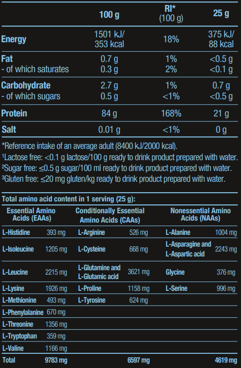 - Πλούσιο σε αμινοξέα διακλαδισμένης αλύσου (BCAAs), τα οποία είναι κρίσιμα για την πρωτεϊνοσύνθεση και την ταχεία αποκατάσταση μετά την προπόνηση.