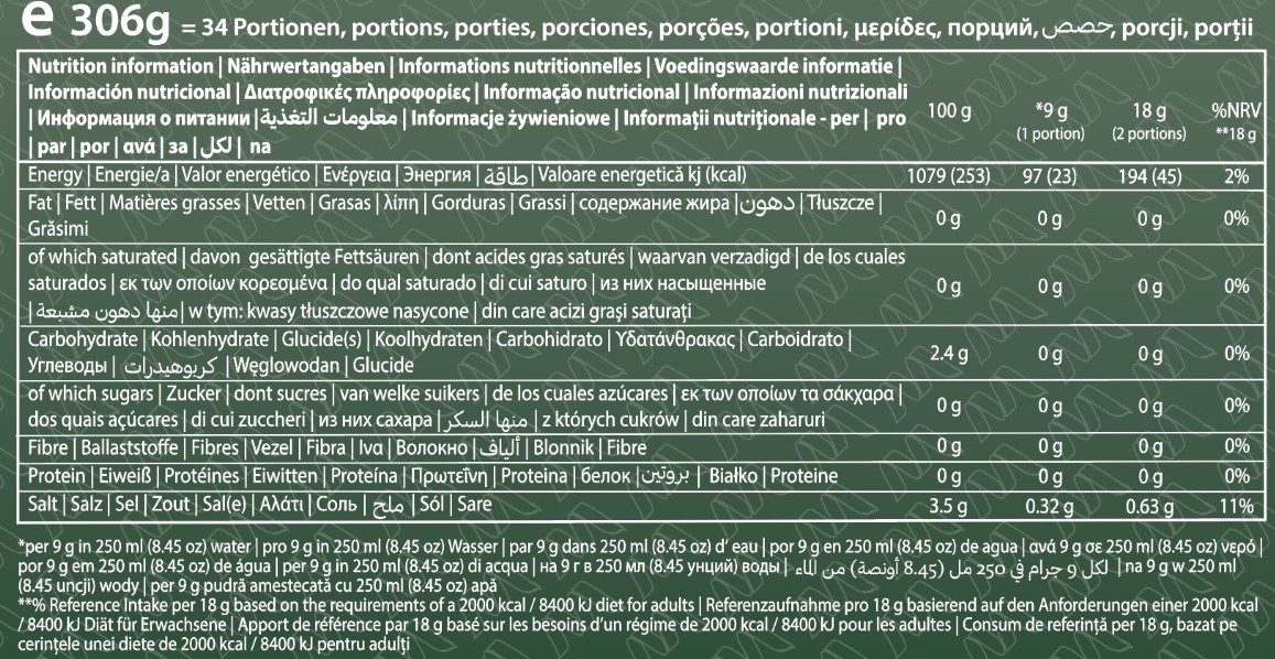 Ingredients: Essential Amino Acid Complex (L-Leucine, L-Isoleucine, L-Valine, L-Threonine, L-Lysine, L-Phenylalanine, L-Hystidine, L-Methyonine, L-Tryptophan), Acidity regulators (Citric acid, Malic acid, Tri-sodium Citrate, Tartaric acid), Electrolyte Blend (Potassium chloride, Calcium carbonate, Sodium chloride, Magnesium hydroxide), Flavour, Anti-caking agent (Silicon dioxide), Sweeteners (Acesulfame K, Sucralose, Enzymatically produced steviol glycosides), Emulsifier (Sunflower lecithin), Colour (Curcumin).
