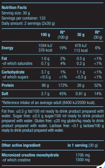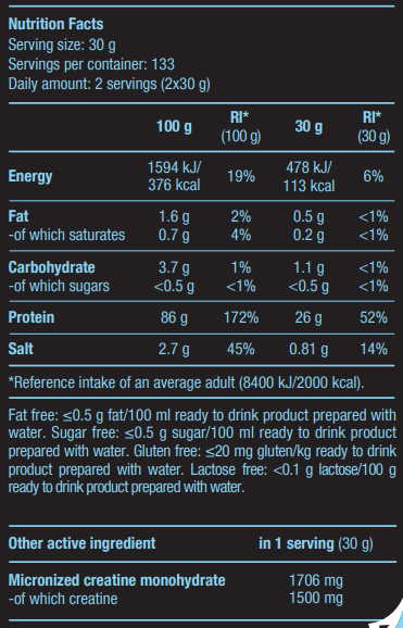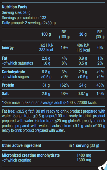 Ingredients: Protein Blend 82% [soy protein isolate, whey protein concentrate (milk), calcium caseinate (milk)], flavour enhancer (glycine and its sodium salt), micronized creatine monohydrate 5.7%, flavourings, emulsifier: lecithins (soy), anti-caking agent (magnesium salts of fatty acids, silicon dioxide), sweeteners (sucralose, acesulfame K), salt, colour (tartrazine)1.