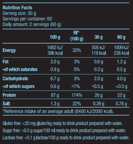 Hydrolysed protein 78%, flavour enhancer (glycine and its sodium salt), L-Glutamine 4%, L-Arginine 3%, flavourings, maltodextrin, thickeners (cellulose gum, carrageenan), emulsifier: lecithins (soy), acid (citric acid), sweetener (sucralose), salt, colour (Allura Red AC***).